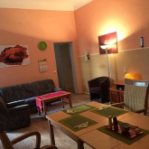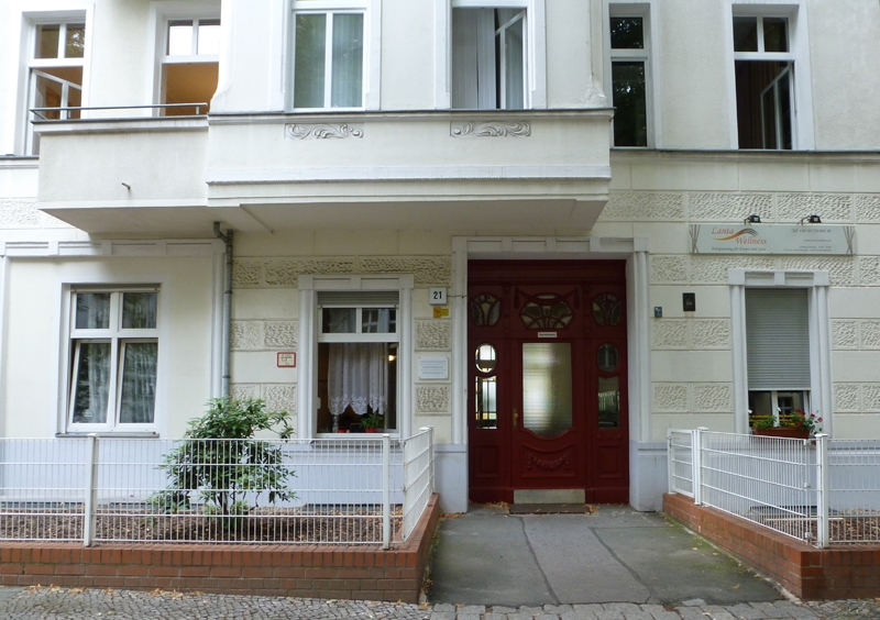 Die Räume für unser betreutes Wohnen in Berlin-Tempelhof sind in einem interessanten Berliner Altbau untergebracht. Dieses Gebäude zeigt seine Besonderheit schon im Eingangsbereich mit Stuckverzierungen, aufwändigen Kronleuchtern und sehr gut erhaltenen Wand- und Fußbodenfliesen. In den hohen Zimmern sind die Fenster mit Oberlichtern passend zur Raumhöhe ebenfalls großzügig ausgelegt und lassen viel Tageslicht herein. Seniorengerechte Toilettenräume und ein Wannenbad gehören ebenfalls zur Wohngemeinschaft. Für die Schönwettertage steht im gepflegten Außenbereich ein hausnaher Sitzbereich zur Verfügung, der auch verschattet werden kann.